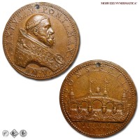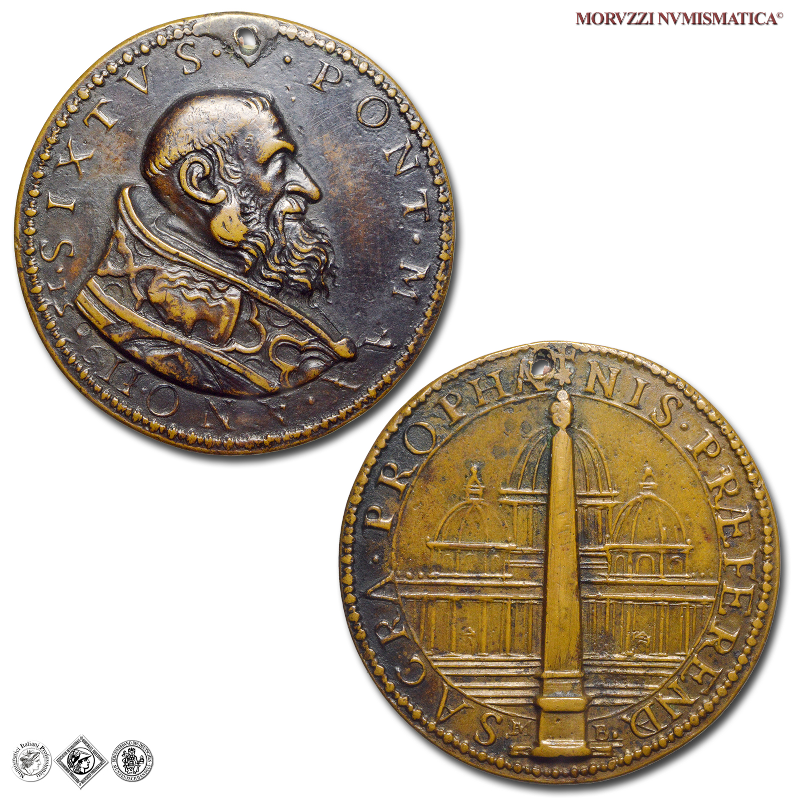 Stato Pontificio, SISTO V, Peretti,1585-1590, MEDAGLIA, Erezione obelisco Piazza San Pietro, Emissione: 1586, D/ • SIXTVS • V • PONT • MAX • ANO • II • / 1586, busto a d. con piviale, R/ • SACRA • PROPHA _ NIS • PRAEFEREND •, l'obelisco e sullo sfondo la Basilica di San Pietro incompleta (priva della facciata e della navata), Opus Michele Balla, Rif. bibl. Modesti, CNORP 832; Metallo: AE, gr. 20,90, (MP160411), Diam.: mm. 39,68, mBB, (RR)