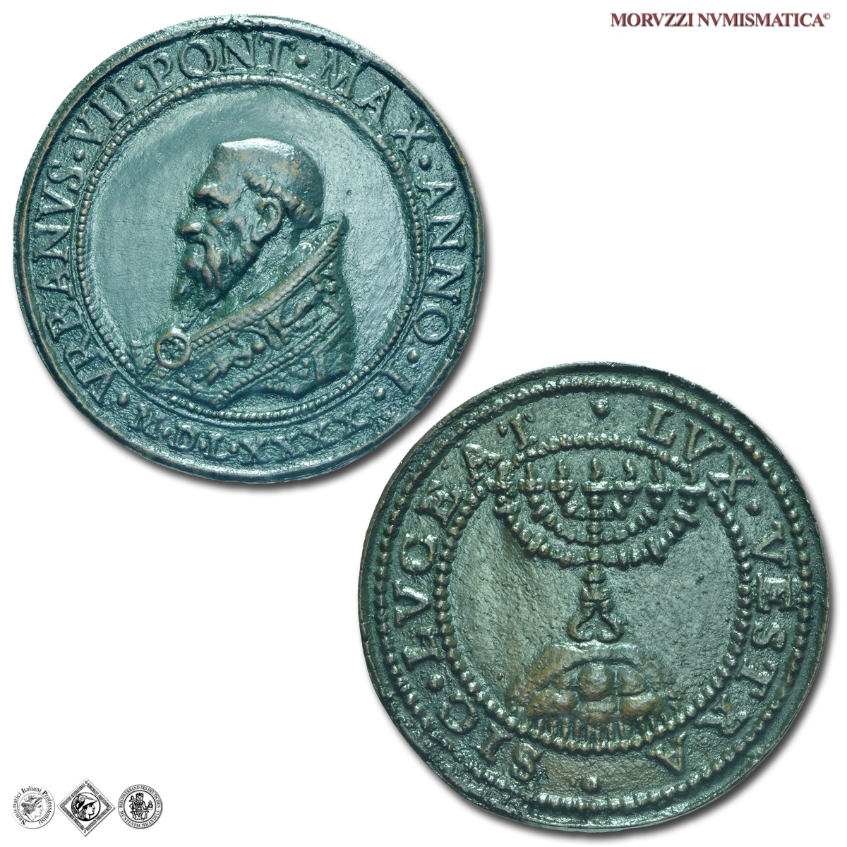 Medaglia fusa copia del tipo realizzato nel XVI e XVIII secolo - Hamerani e XIX secolo - Mazio, con conii rifatti dagli incisori della famiglia Hamerani, su modello della medaglia di Angelo Michele Balla, per ricordare il Pontificato di Urbano VII e la sua prematura scomparsa.