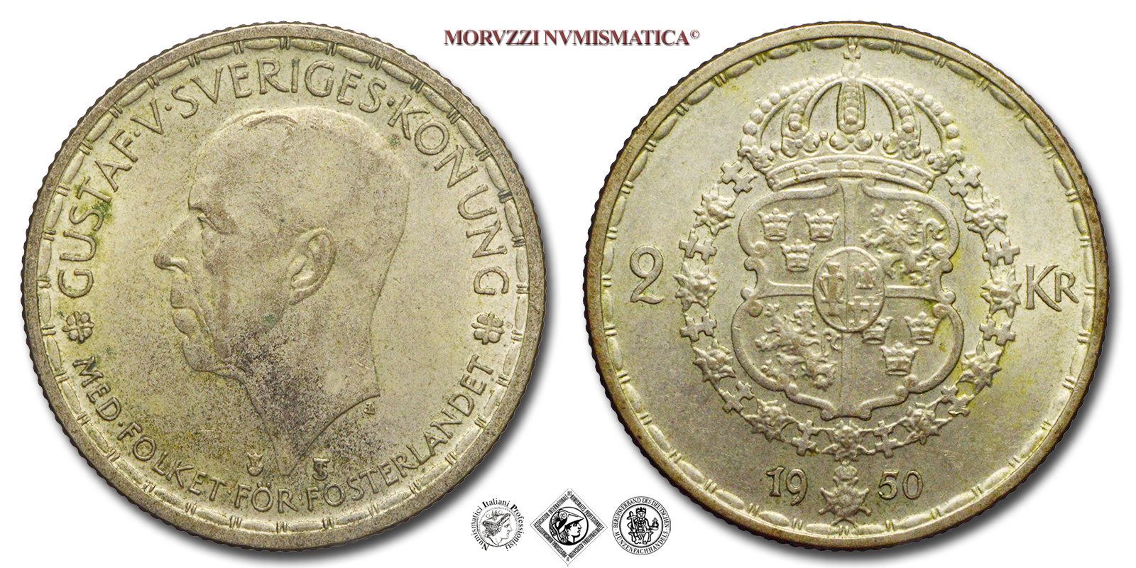 Svezia, GUSTAVO V, 1907-1950, CORONE 2, Emissione: 1950, D/ Testa nuda del re Gustavo V, rivolta a sinistra. La punta del taglio del collo divide i segni di zecca (EL. TS) ai lati. Sul bordo la legenda (GUSTAF·V·SVERIGES·KONUNG) e il motto del Re (MED·FOLKET·FÖR·FOSTERLANDET). Incisore: Erik Lindberg, R/ Lo stemma della Svezia coronato e ornato, circondato dalla Catena dell'Ordine dei Serafini, divide il valore (2 KR) e la data (1950), Zecca di Stoccolma, Rif. bibl. KM, 787; Metallo: AR, gr. 14,02, (ME95257), Diam.: mm. 30,99, FDC
