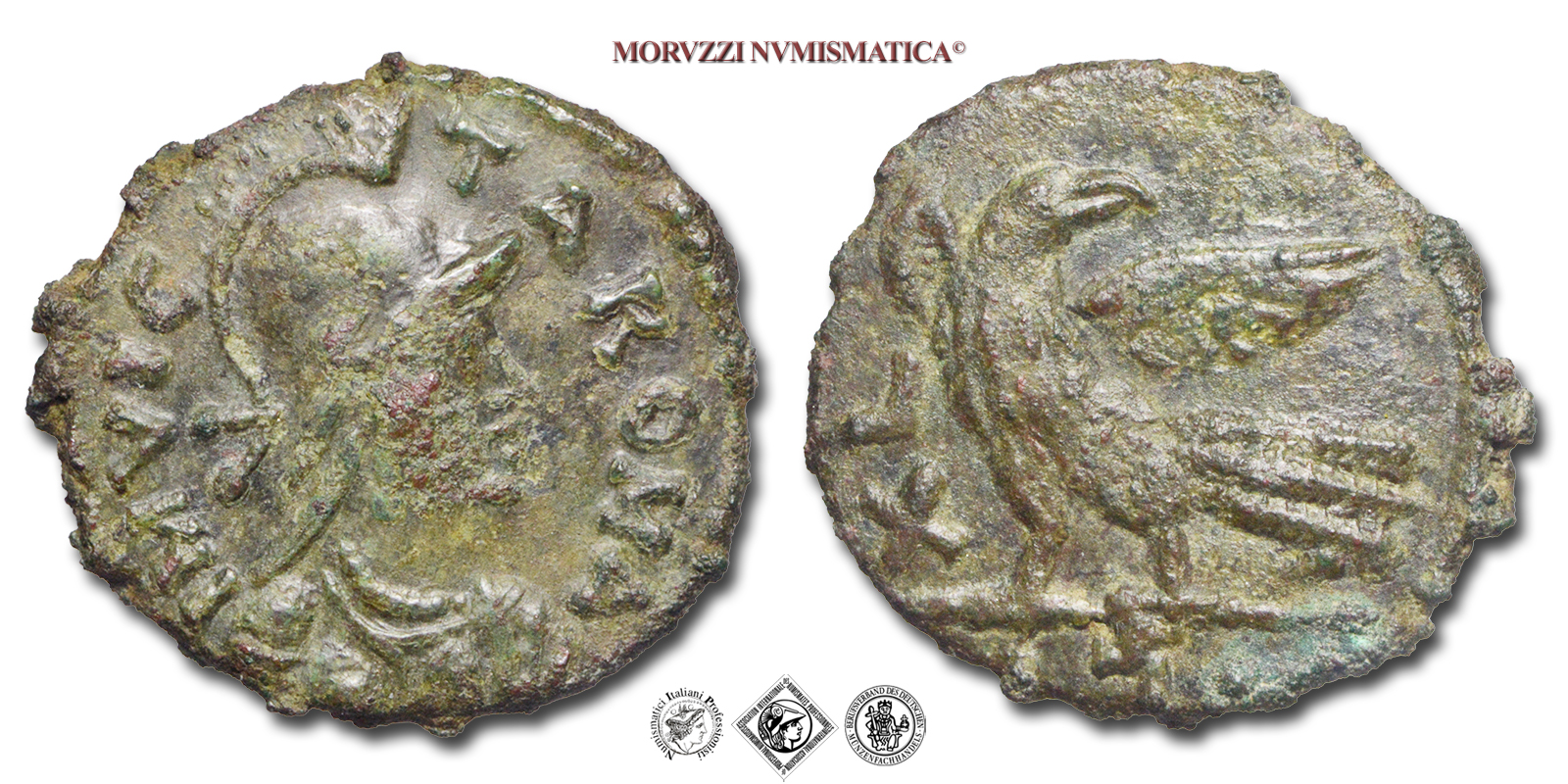 Ostrogoti, TEODORICO e ATALARICO, 522-534 d.C., FOLLIS da 40 NUMMI, Emissione: 522-534 d.C., D/ INVICTA ROMA, busto elmato e corazzato a d., R/ Aquila stante a s. retrospiciente, a s. il segno del valore XL; all'esergo .A. ?, Zecca di Roma, Rif. bibl. Arslan, 87; Metallo: AE, gr. 8,47, (MR159477), Diam.: mm. 25,99, mSPL, (R)
