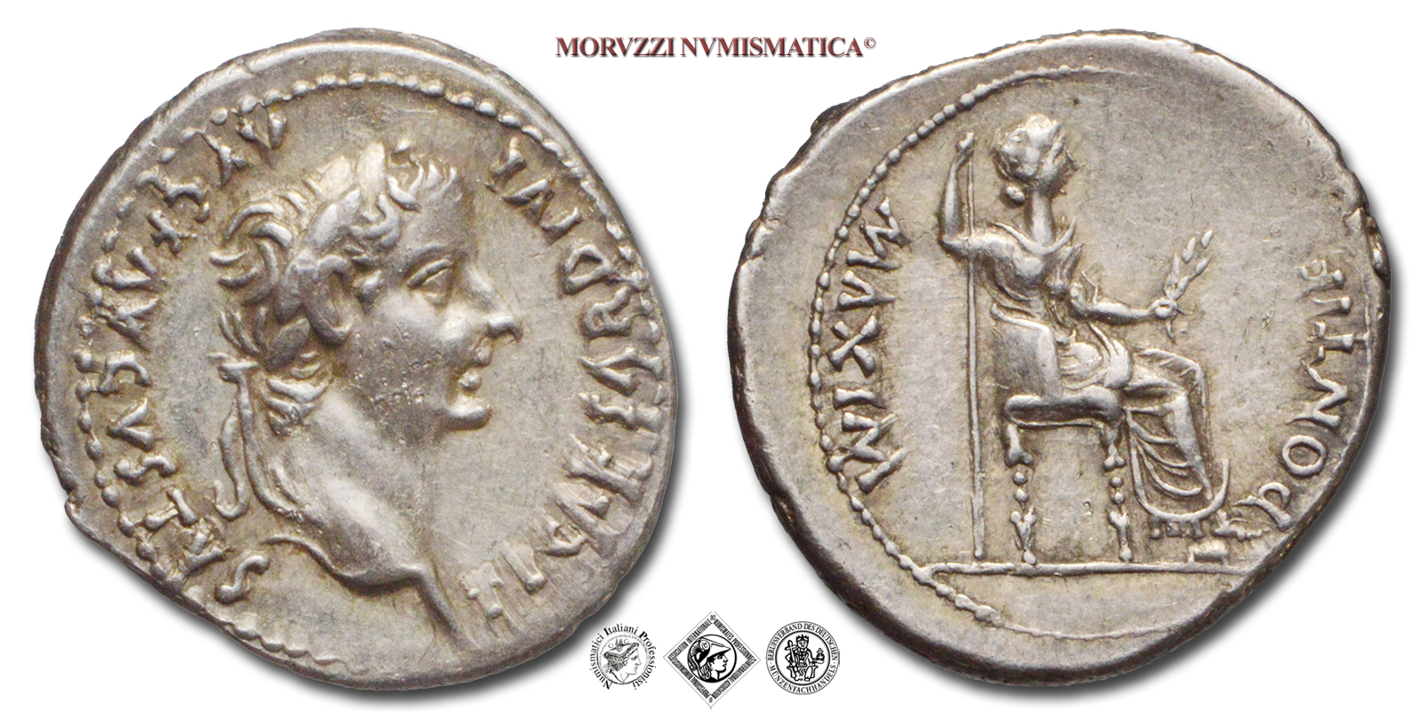 Impero Romano, TIBERIO, 14-37 d.C., DENARIO, Emissione: 36-37 d.C. circa, D/ TI CAESAR DIVI AVG F AVGVSTVS, testa laureata a destra, R/ PONTIF MAXIM, Livia seduta a destra con lungo scettro nella mano destra e ramoscello nella sinistra, Zecca di Lugdunum, Rif. bibl. R.I.C., 30; Cohen, 16/Fr. 2; Metallo: AR, gr. 4,02, (MR163183), Diam.: mm. 20,37, SPL