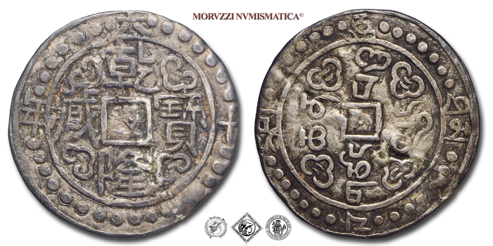 Tibet, AIAN LONG, SHO, Emissione: 1793, D/ 五 乾 年藏 寶十 隆 九, i quattro ideogrammi cinesi letti dall'alto in basso, da destra a sinistra, con nuvole agli angoli, il tutto con altri ideogrammi intorno (che indicano l'anno), R/ ལྔ་བཅུ་ང་ དགུ་ ཆན གཙང - པའུ ལུང, i caratteri tibetani si leggono dall'alto in basso, da destra a sinistra, con nuvole agli angoli, il tutto con altri caratteri intorno (che indicano l'anno), Tapchi Electric Machine Factory (Lhasa, Tibet, China), Rif. bibl. KM, C72; Metallo: AR, gr. 3,60, (ME96317), Diam.: mm. 26,62, BB