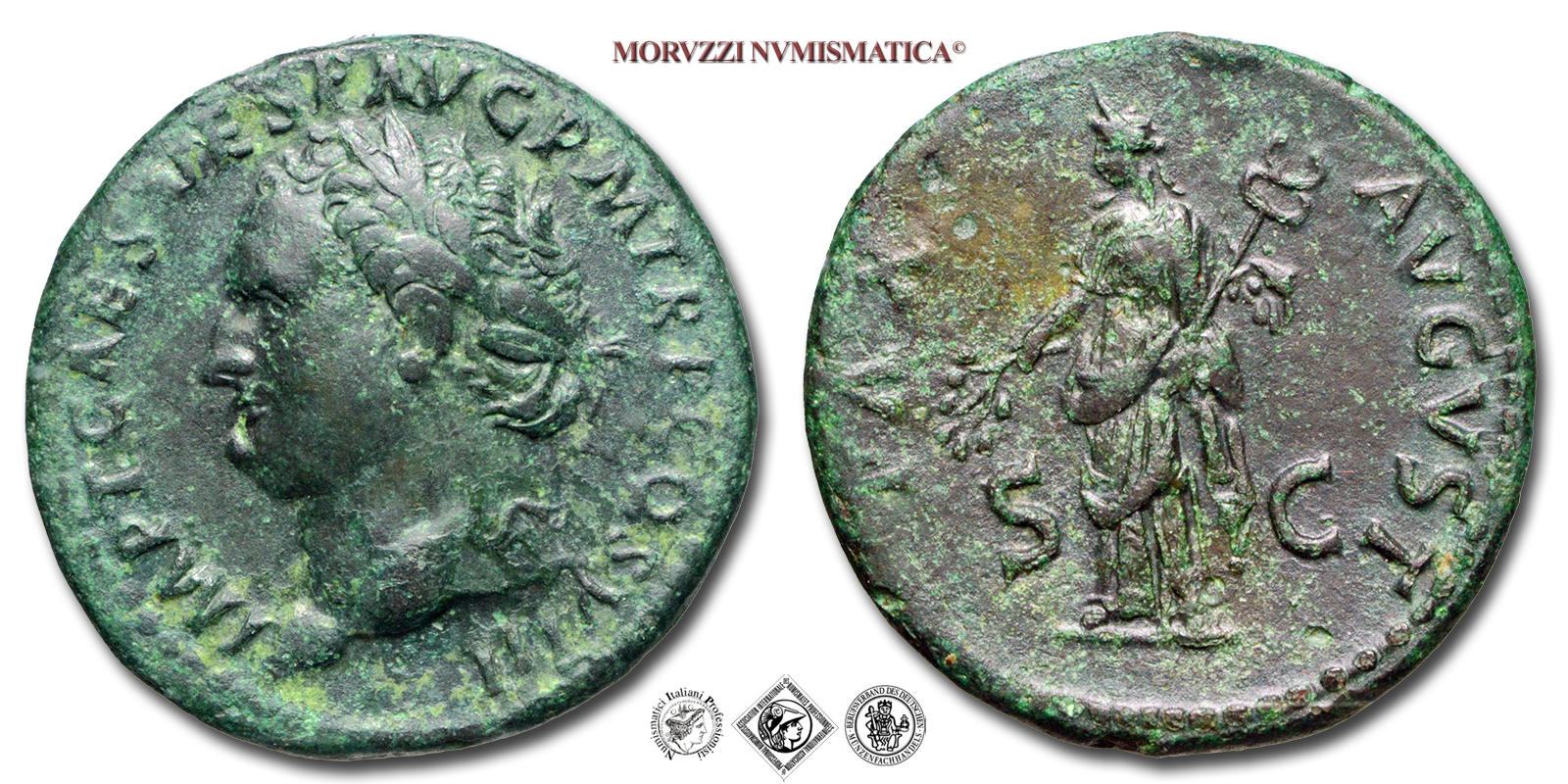 Impero Romano, TITO, 79-81 d.C., ASSE, Emissione: 80-81 d.C., D/ IMP T CAES VESP AVG P M TR P COS VIII, testa laureata a s., R/ PAX AVGVST, S C, la Pax stante a s. con ramoscello d'ulivo nella d. e cornucopia nella s., Zecca di Roma, Rif. bibl. R.I.C., 230; Cohen, 148; Metallo: AE, gr. 11,18, (MR11392), Diam.: mm. 27,04, qSPL