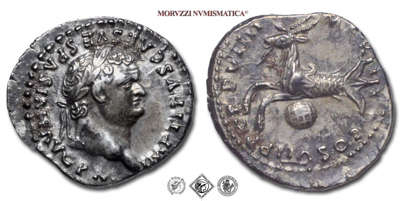 Impero Romano, TITO, 79-81 d.C., DENARIO, Emissione: 79 d.C., D/ IMP TITVS CAES VESPASIANO AVG P M, testa laureata a destra, R/ TR P VIIII IMP XV COS VII P P, capricorno a sinistra, sotto globo, Zecca di Roma, Rif. bibl. R.I.C., 37/R; Cohen, 294/Fr.2; Metallo: AR, gr. 3,15, (MR161600), Diam.: mm. 19,69, SPL, (R)