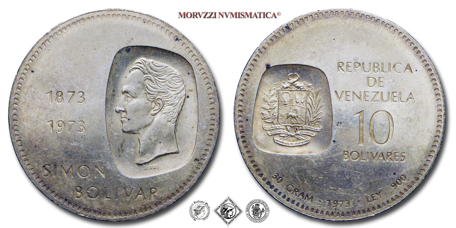 Venezuela, REPUBBLICA, Dal 1823, BOLIVARES 10, Centenario dell'effige di Simon Bolivar, Emissione: 1973, D/ REPUBLICA DE VENEZUELA, Piccolo stemma in stile francobollo a sinistra. Legenda e valore (10 BOLIVARES) a destra. Peso (30 GRAM.), data (• 1973 •) e finezza (LEY 900) in basso, R/ Busto rivolto a sinistra, in stile francobollo, a destra. Con date (1873 1973) a sinistra e nome (SIMON BOLÍVAR) in basso. Nome dell'incisore (BARRE) alla base del busto. Incisore: Désiré-Albert Barre, Royal Canadian Mint of Ottawa, Rif. bibl. KM., Y45; Metallo: AR, gr. 30,05, (ME137615), Diam.: mm. 39,07, FDC