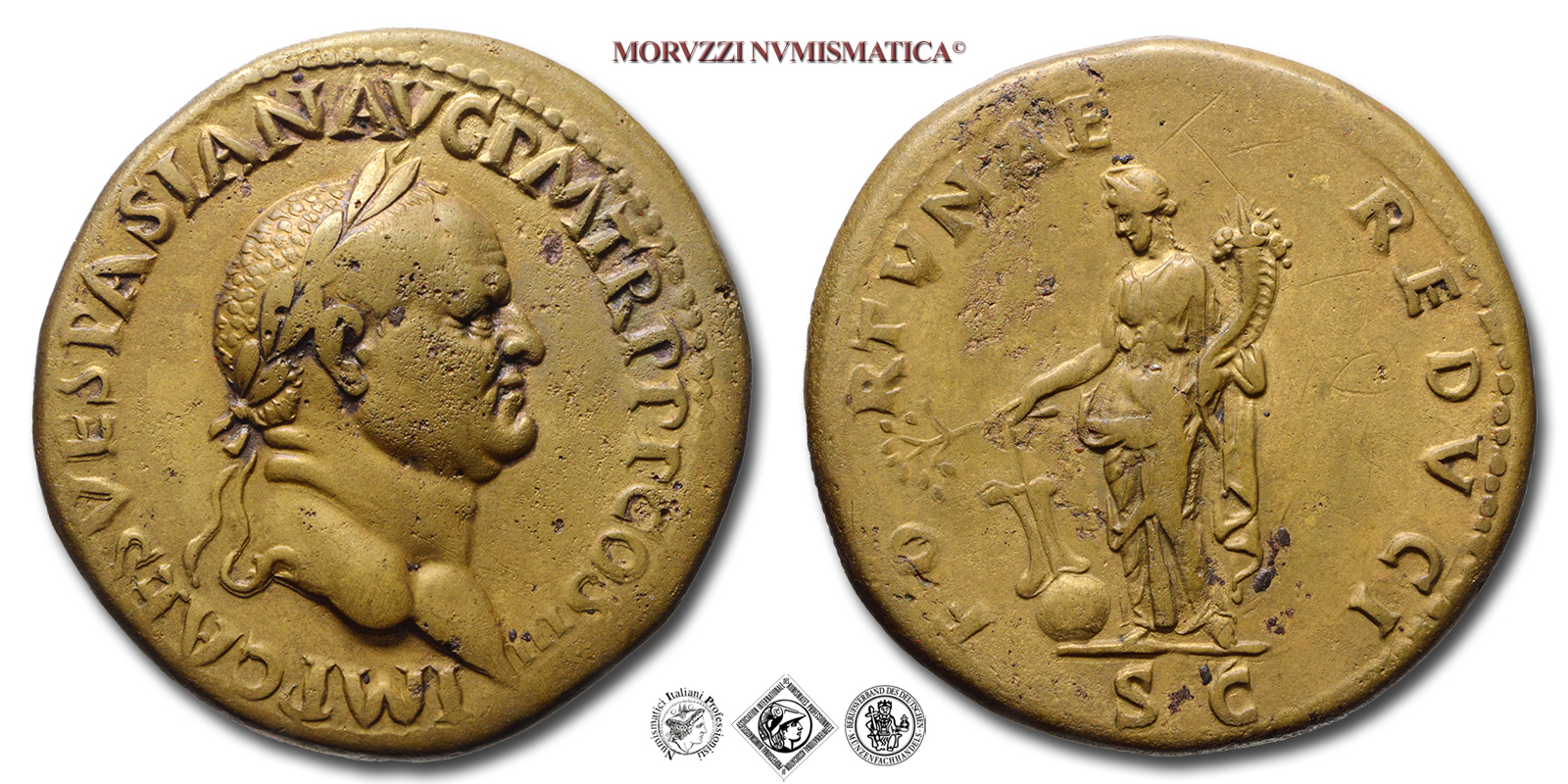 Impero Romano, VESPASIANO, 69-79 d.C., SESTERZIO, Emissione: 72-73 d.C., D/ IMP CAES VESPASIAN AVG P M TR P P P COS III, testa laureata a destra, R/ FORTVNAE REDVCI, S C, la Fortuna stante a sinistra con timone su globo nella destra e cornucopia nella sinistra, Zecca di Roma, Rif. bibl. R.I.C., 374/R2; Cohen, 192/Fr.4; Cayon, 44; Metallo: AE, gr. 25,67, (MR136071), Diam.: mm. 33,78, mBB, (RR)