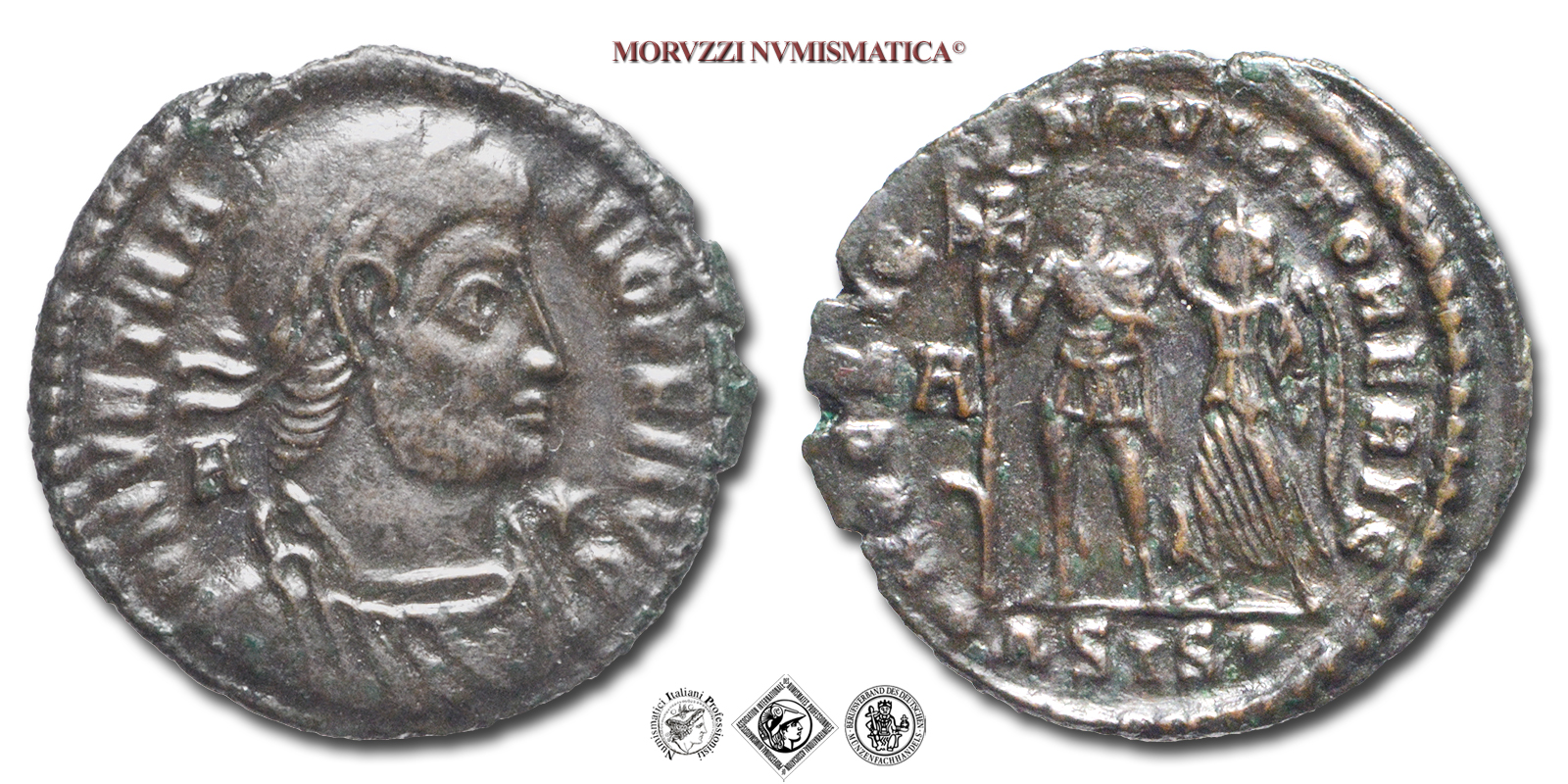 Impero Romano, VETRANIO, 350 d.C., MAIORINA, Emissione: 350 d.C., D/ D N VETRANIO P F AVG, busto diademato con paludamento a destra, R/ HOC SIGNO VICTOR ERIS, ASIS, la Vittoria incorona l'imperatore stante a sinistra con lo scettro cruciforme nella destra, Zecca di Siscia, Rif. bibl. R.I.C., 135/R2; Cohen, 4/Fr.25; Metallo: AE, gr. 4,68, (MR162444), Diam.: mm. 23,17, mBB, (R)