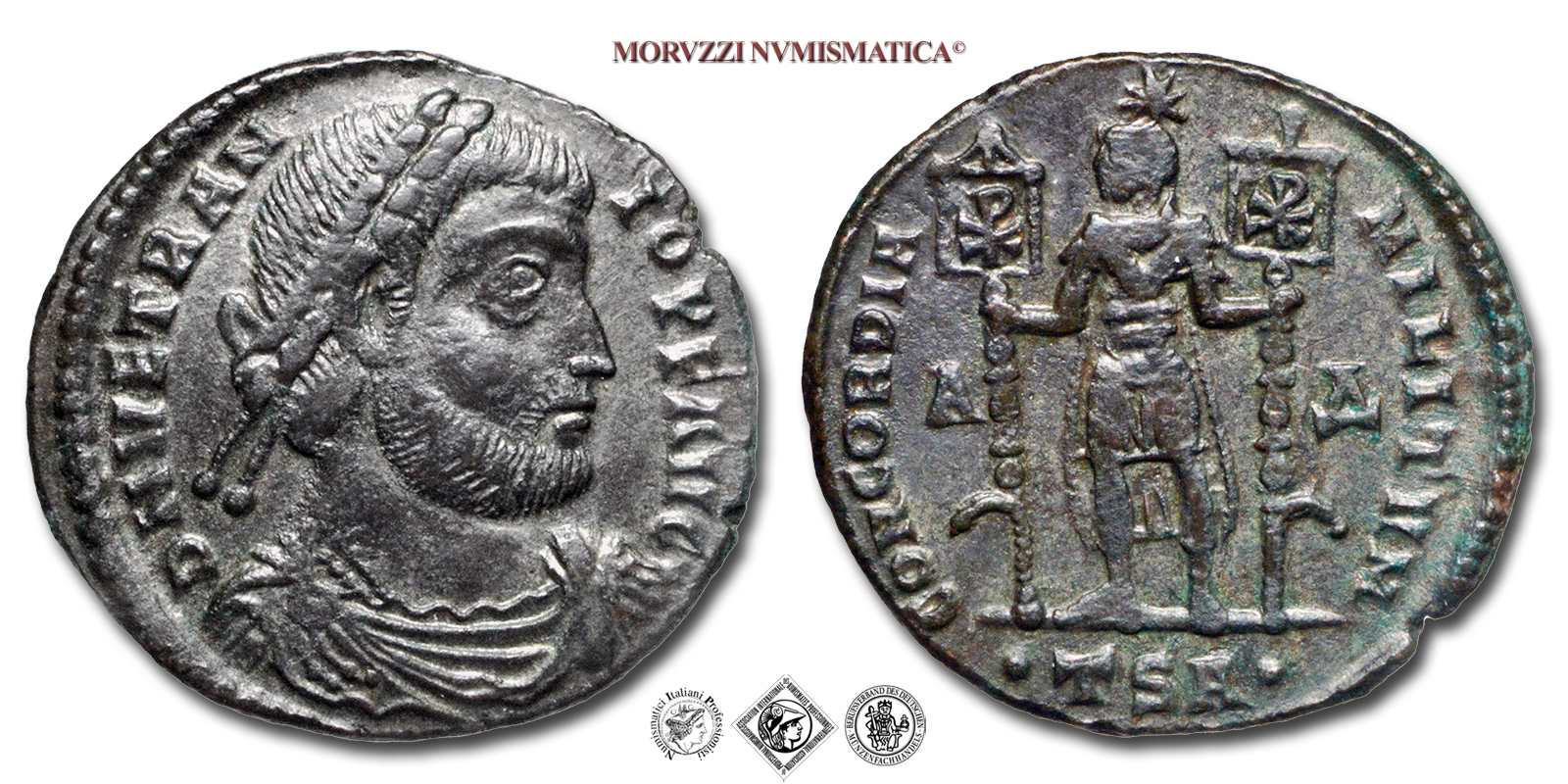 Impero Romano, VETRANIO, 350 d.C., MAIORINA, Emissione: 350 d.C., D/ D N VETRANIO P F AVG, busto diademato con paludamento a destra, R/ CONCORDIA MILITVM, A#D#, TSA tra due globetti, l'imperatore in abiti militari con una stella sulla testa stante a sinistra con due stendardi con il chi-rho sulla bandiera, Zecca di Tessalonica, Rif. bibl. R.I.C., 135/R2; Cohen, 1/Fr.25; Metallo: AE, gr. 5,78, (MR160845), Diam.: mm. 24,36, SPL, (RR)